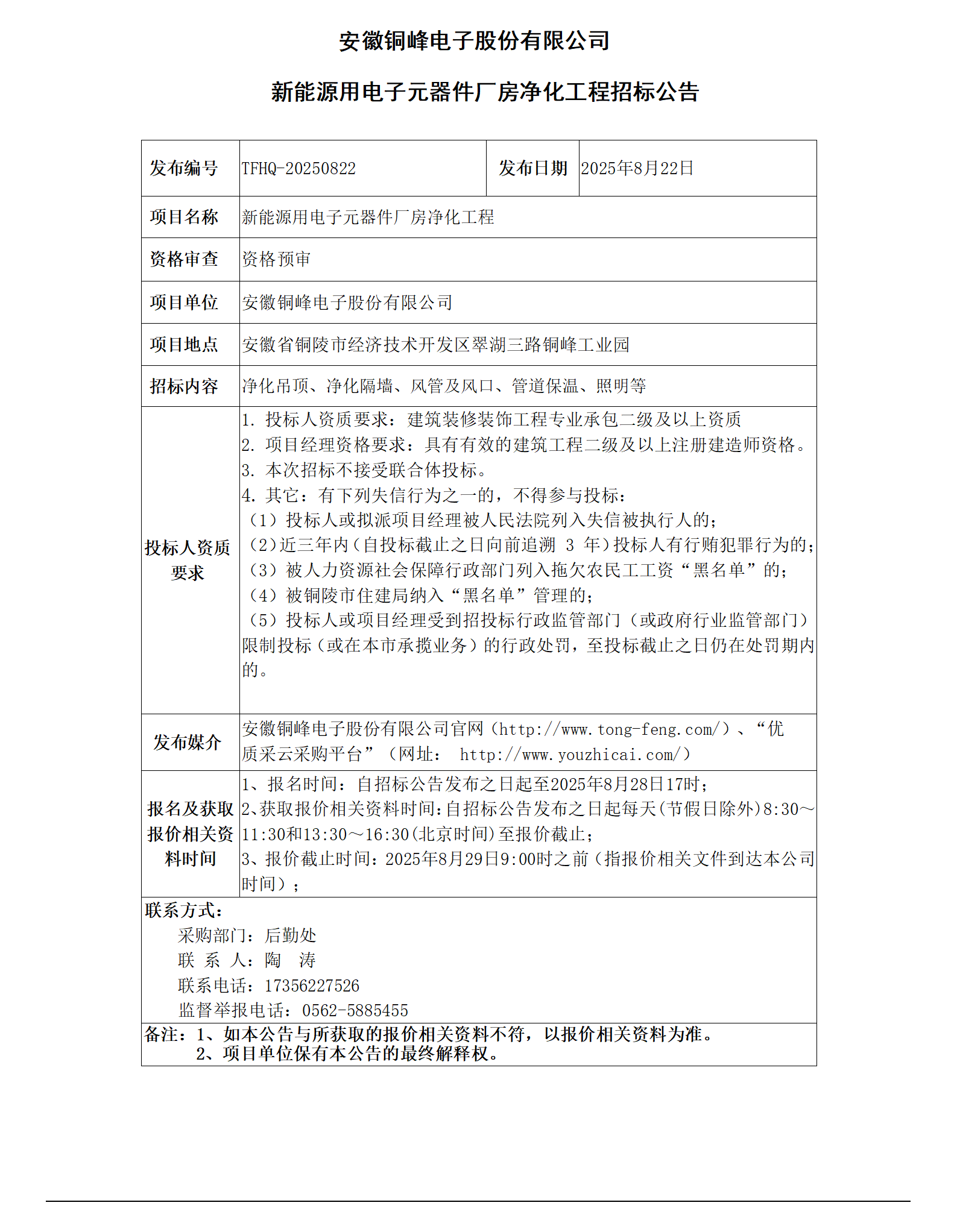 安徽銅峰電子股份有限公司 (新能源用電子元器件廠房凈化工程 招標公告)_01