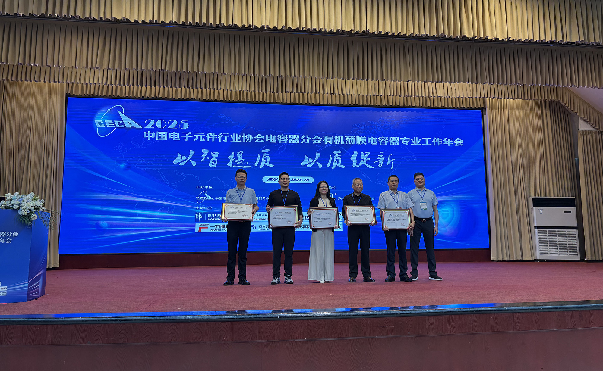 10月14日至17日,中國電子元件行業(yè)協會電容器分會有機專業(yè)2025年工作年會在四川瀘州成功舉辦。中電元協常務理事、電容器分會第九屆副理事長、公司總經理鮑俊華代表公司出席并作主題交流報告。薄膜分公司獲評電容器分會2025年度“優(yōu)秀供應商”榮譽稱號。